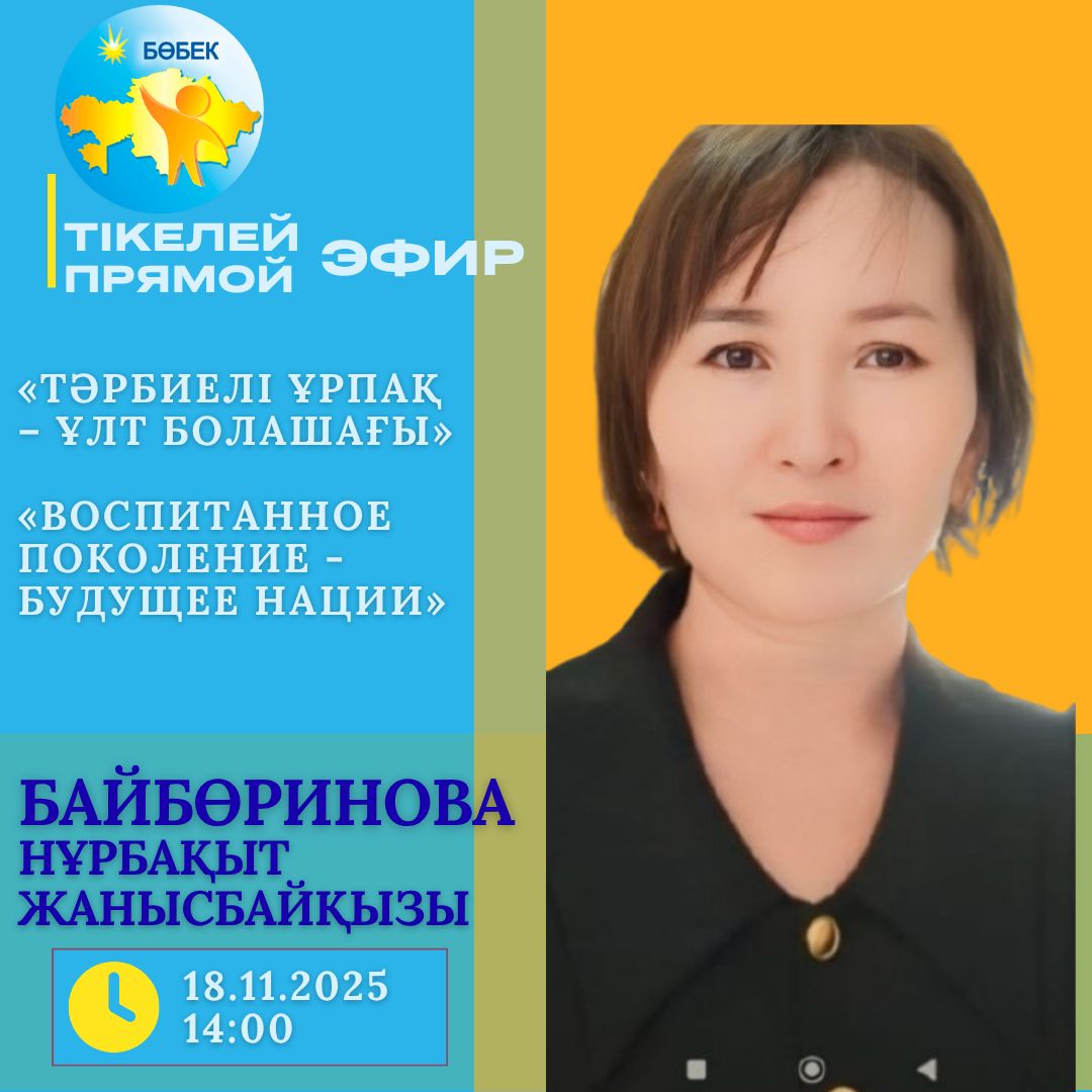 Анонс прямого эфира18 ноября 2025 года в 14:00 часов воспитатель учебно-оздоровительного комплекса ННПООЦ «Бобек» Байбөринова Нұрбақыт Жанысбайқызы выступит в прямом эфире на тему: «Воспитанное поколение — будущее нации». Мероприятие будет транслироваться на странице центра «Бөбек», сети Facebook.