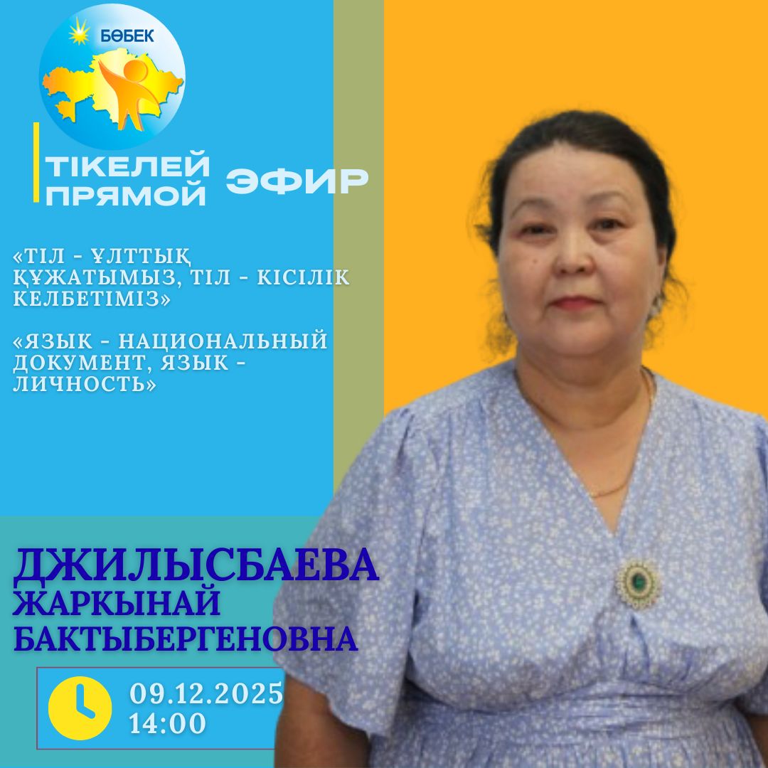Анонс прямого эфира09 декабря 2025 года в 14.00 часов учитель казахского языка и литературы гимназии «Бобек» Джилысбаева Жаркынай Бактыбергеновна выступит в прямом эфире на тему «Язык – национальный документ, язык – личность». Мероприятие будет транслироваться на странице Центра «Бөбек», сети Facebook.