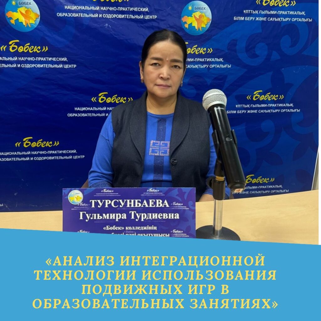 23 декабря 2025 года в 14:00 преподаватель физическая культура колледжа «Бөбек» Турсунбаева Гулмира Турдиевна выступит в прямом эфире на тему «Анализ интеграционной технологии использования подвижных игр в образовательных занятиях». Мероприятие будет транслироваться на социальной странице центра «Бөбек» в сети Facebook.