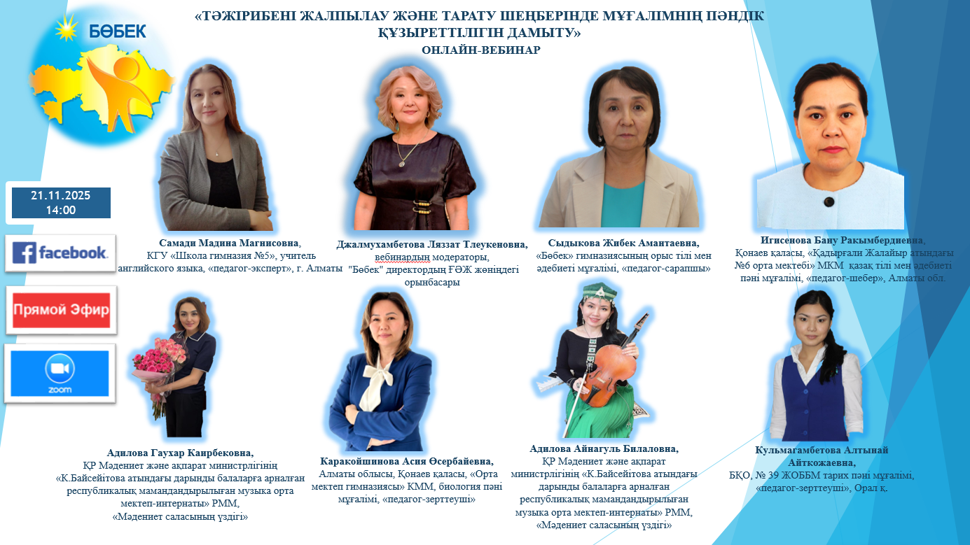 Республиканский онлайн-вебинар21 ноября 2025 года в 14.00 в гимназии «Бөбек» состоится республиканский онлайн-вебинар по распространению и обобщению педагогического опыта на тему «Развитие предметных компетенций учителя в рамках обобщения и распространения опыта».ННПООЦ «Бөбек» МП РК, ГКУ «Средняя школа-гимназия», ГУ «Отдел образования по городу Қонаев, Управления образования Алматинской области, РГУ «Республиканская средняя специализированная музыкальная школа-интернат для одаренных […]